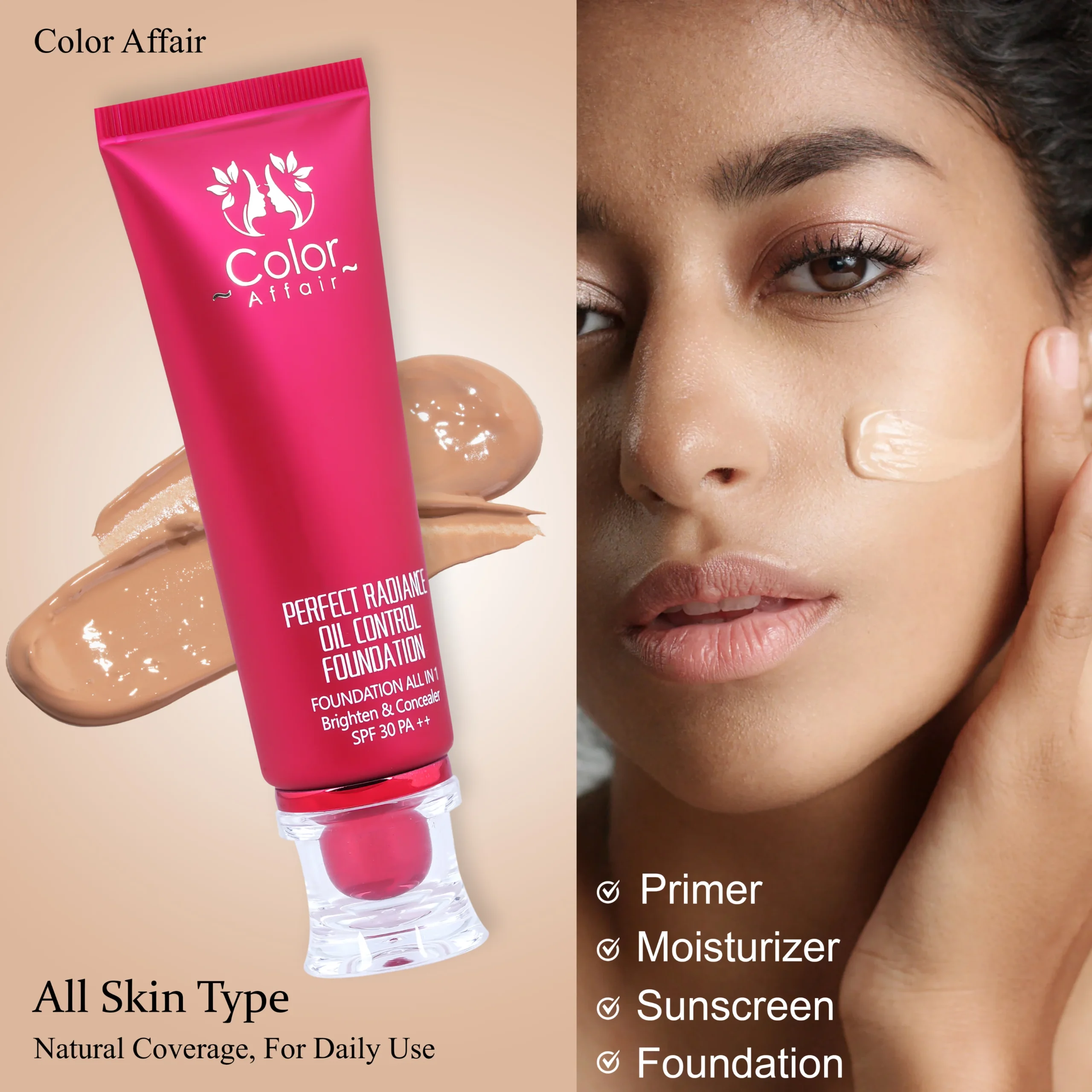 Colors Affair Base Illuminator works like magic to give your skin an instant radiant glow with its special shiny particles. Acting as a primer for makeup, it not only makes your skin look even and bright but also provides a protective shield against the sun. This multitasking illuminator goes beyond by adding a touch of brilliance to your skin, creating a dewy look that enhances your natural beauty. With its unique color-changing elements, it achieves a fresh and natural appearance, as if you're not wearing makeup at all. Say hello to a single product that effortlessly delivers a fresh and pretty face, combining the benefits of radiance, protection, and a dewy finish in one easy step!